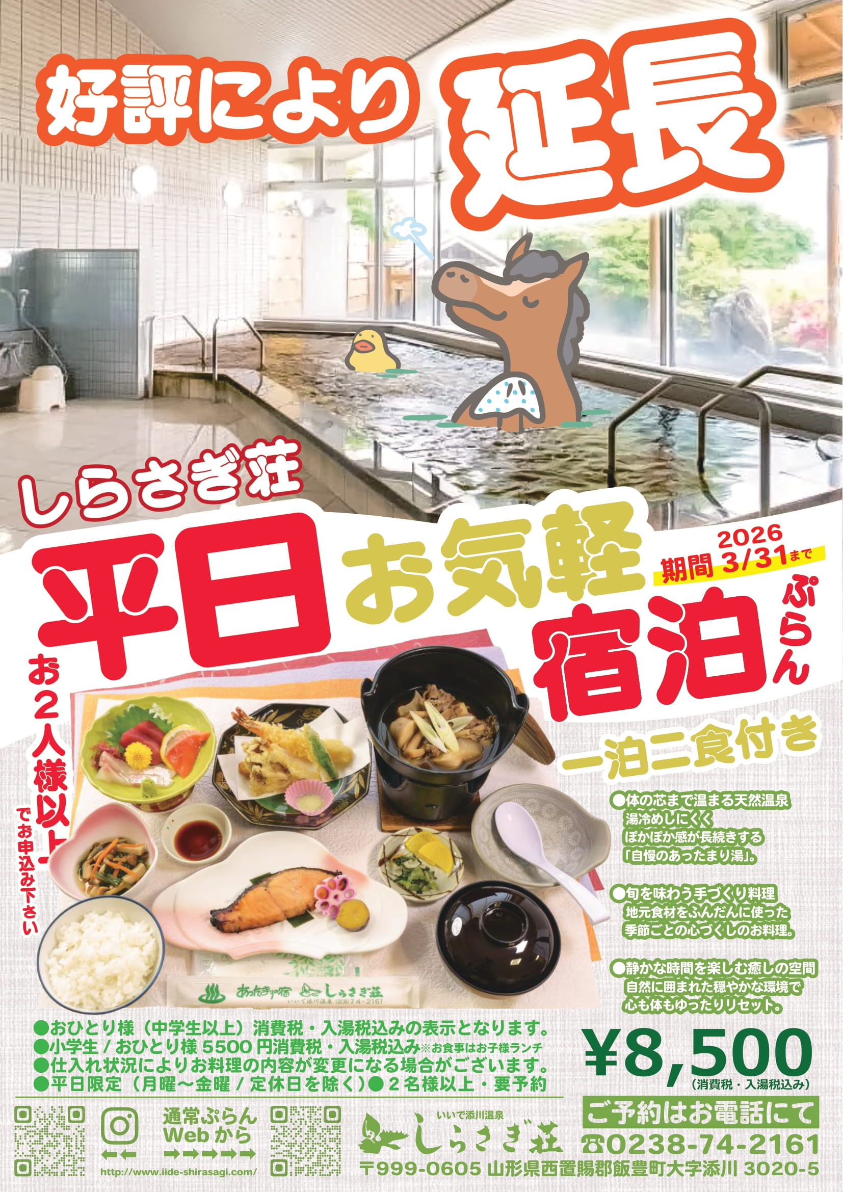 山形県置賜地方にある散居集落に囲まれたのどかなまち飯豊町。そこにあるのは心も体も癒してくれる人情あふれた温泉宿です。 保養・湯治に最適な当宿の温泉は地元の人々に愛され続けております。